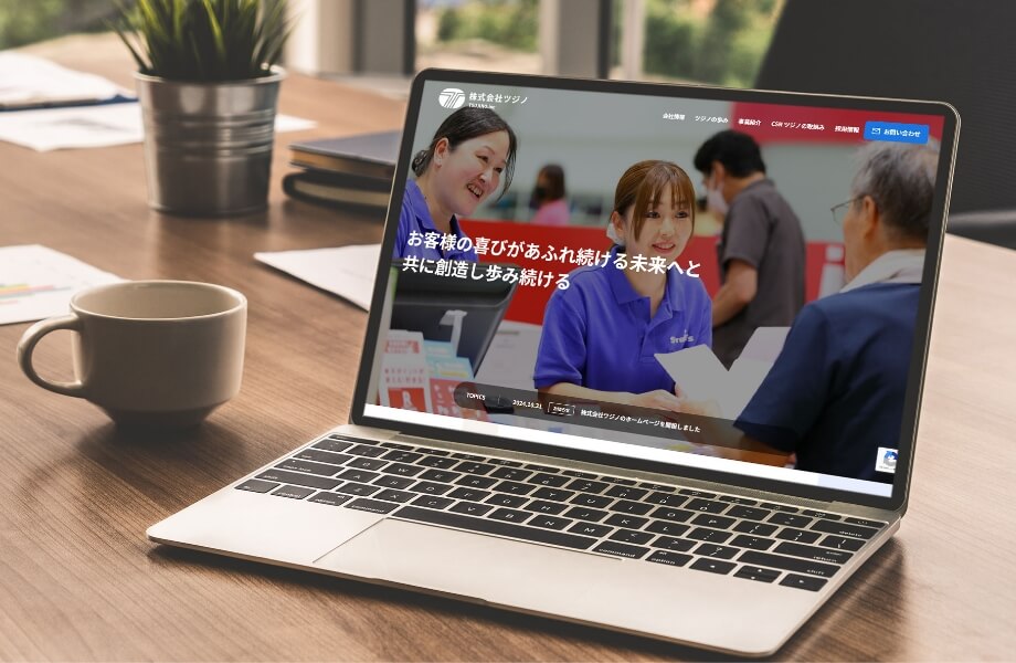 - コーポレートサイトの制作ですが、採用サイトとしても機能するようにコンテンツの内容を組み立てました。会社情報はもちろんのこと、「ツジノの歩み」や「事業内容」・「CSR ツジノの取組」、そして「採用情報」も1ページに無駄なく情報をまとめています。