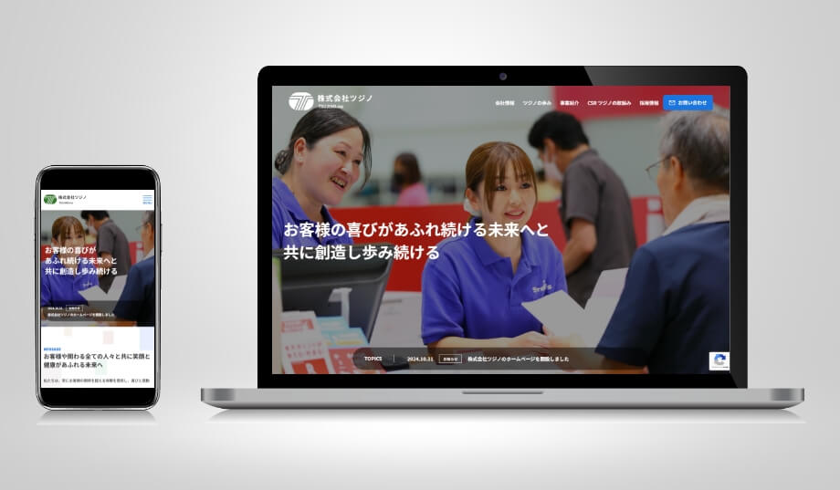 - コーポレートサイトの制作ですが、採用サイトとしても機能するようにコンテンツの内容を組み立てました。会社情報はもちろんのこと、「ツジノの歩み」や「事業内容」・「CSR ツジノの取組」、そして「採用情報」も1ページに無駄なく情報をまとめています。