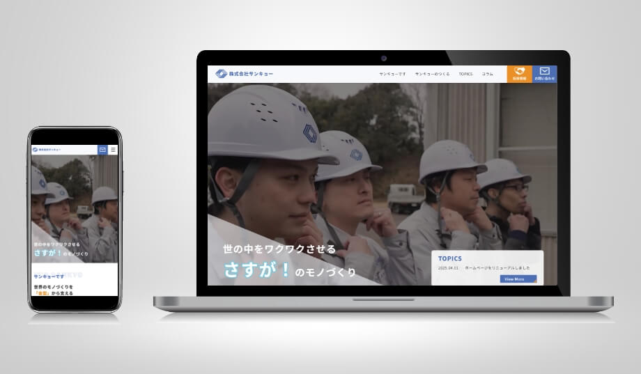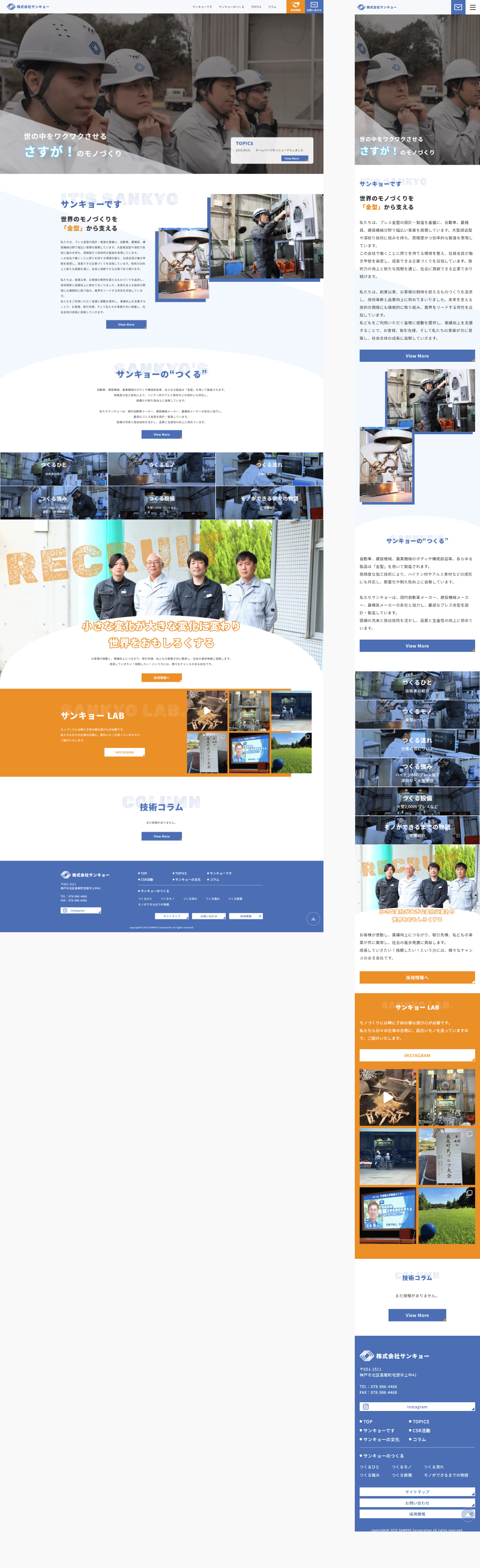 『新しい未来へと舵を切る!いよいよ始まる。サンキョーがワクワクさせる“さすが!”のモノづくりと物語。』をテーマにデザイン。メインビジュアルには、元気な社員さんが工場へ向かい1日の始まりからを表現。事業紹介など、サンキョーの強みである職人と技術力を訴求するためにメニュー名には「つくる」という言葉を使用し、“モノづくり”の会社であることを表現しています。